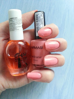 După cum v-am spus ambele oje sunt de la Farmasi. Mai am oje de la această firmă și îmi plac mult. Astăzi mi-am făcut manichiura cu oja Farmasi nr 20(eu am numit-o piersicuță) și m-am umplut de nervi. Oja face brazde și se usucă foarte repede și chiar am avut impresia atunci când m-am dat că nici măcar nu s-a întins uniform.