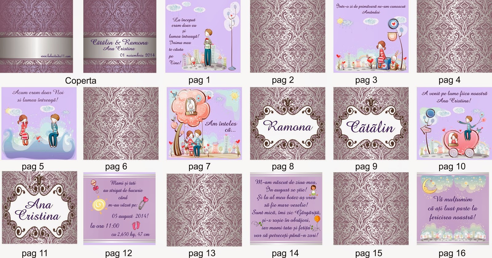 Am găsit niște cărticele cu o mică povestioară care era pentru nuntă și tot așa erau și pentru botez. Eu le-am combinat în așa fel încât am mai scos din text sau am mai introdus și am făcut un fel de poveste a noastră mai plastică! Cărticica a arătat așa și chiar am fost mulțumită de alegerea făcută.