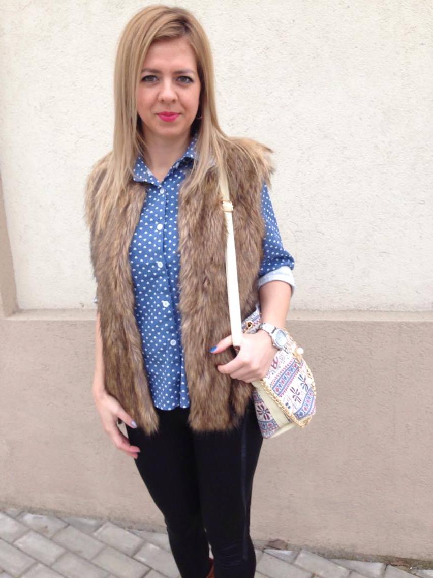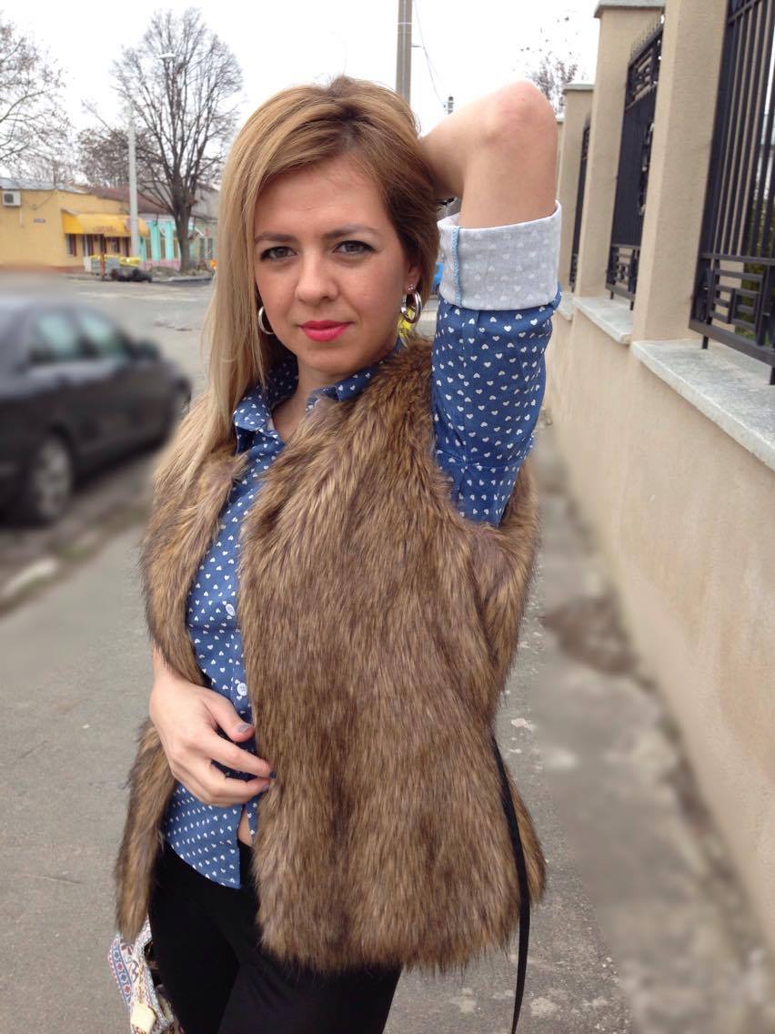 Vesta de blană a înlocuit geaca. Abia aștept să scap de geci și să încep să port vestele mele de blăniță. Ador vestele pentru perioada asta mai puțin friguroasă. Un alt aspect pe care vreau neaparat să îl menționez este machiajul realizat cu