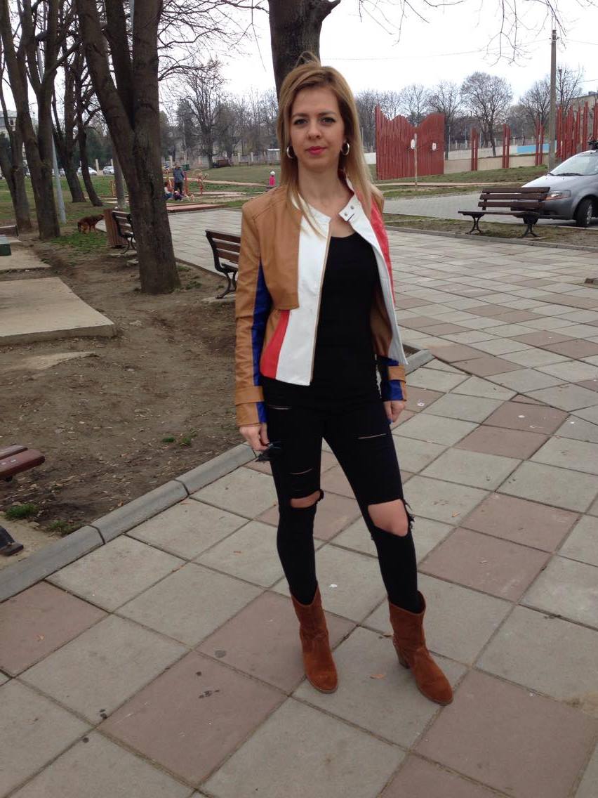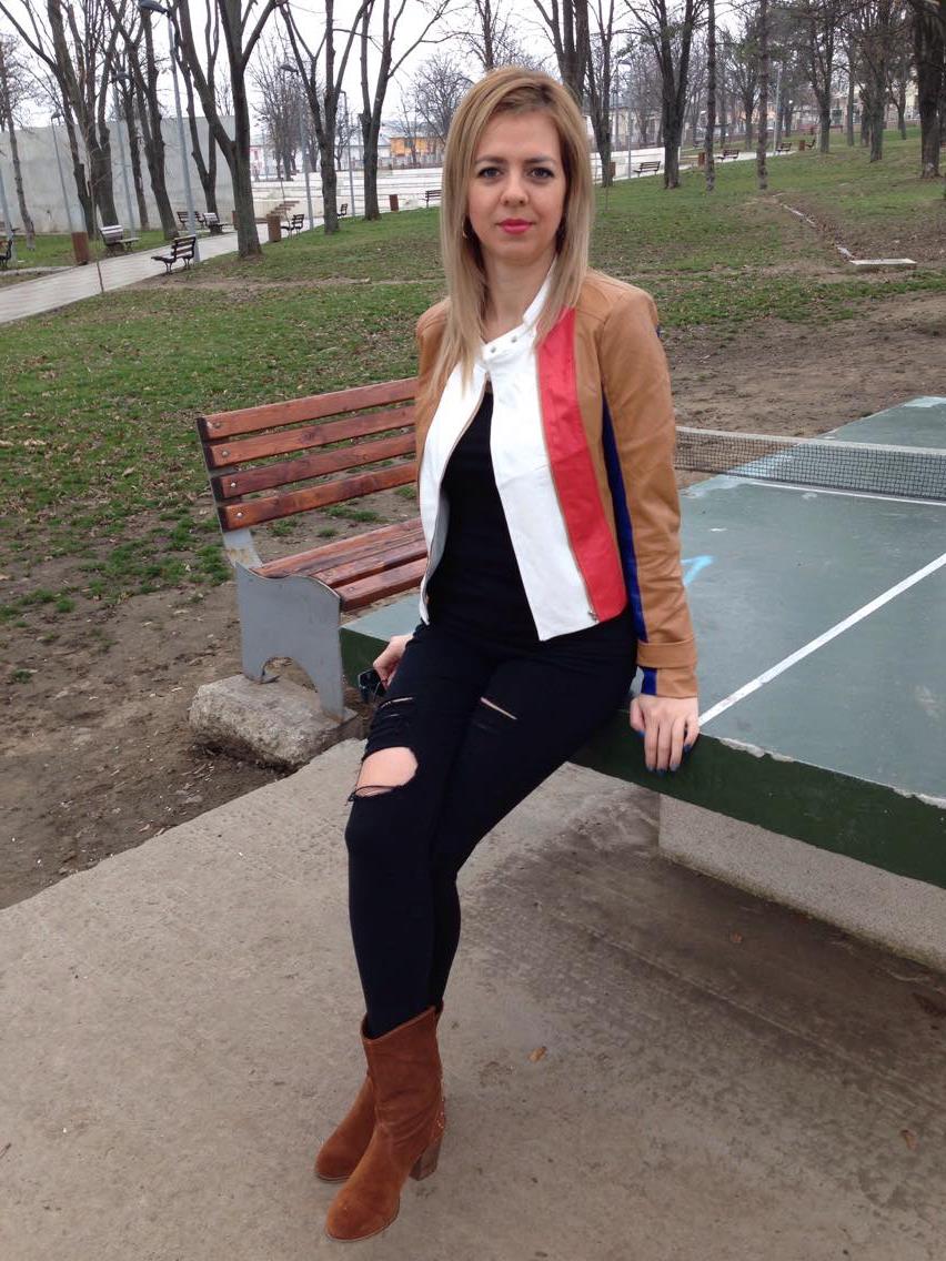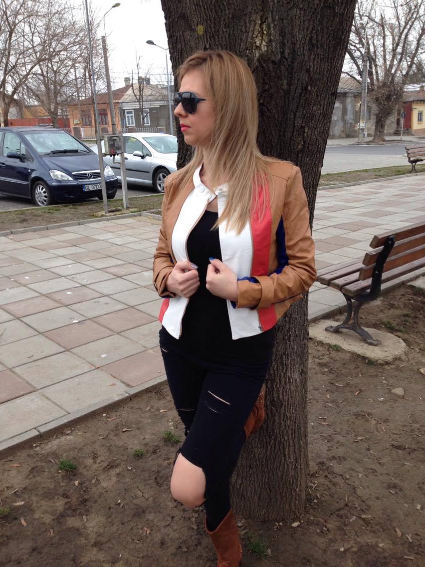 Sugestia mea de astăzi este o ținută extrem de comodă. Vedeta ținutei de astăzi este geaca colorată din piele. Geaca este dintr-o piele moale, plăcută la atingere și tare finuță. Mă bucur să văd că mânecile sunt suficient de lungi. Mi-ar fi plăcut să fie puțin mai lungă în talie dar se pare că trendul din ultimul timp este ca gecile să fie până în talie. Datorită faptului că este atât de colorată nu cred că ar merge combinată cu o fustă. Mi-a plăcut să pun geaca în evidență și să mă îmbrac în negru și să îmi asortez cizmele cu geaca. Combinația este perfectă.
