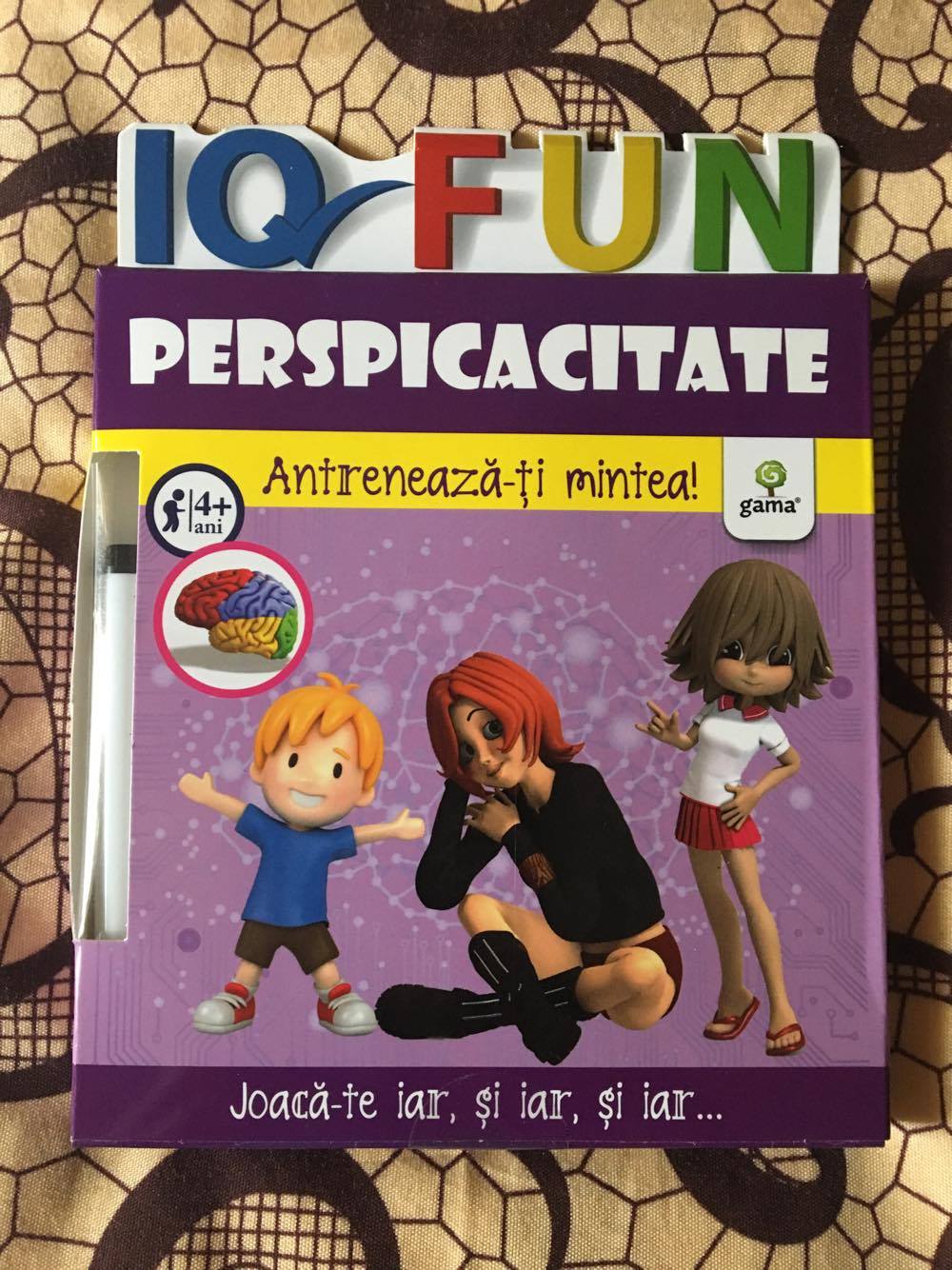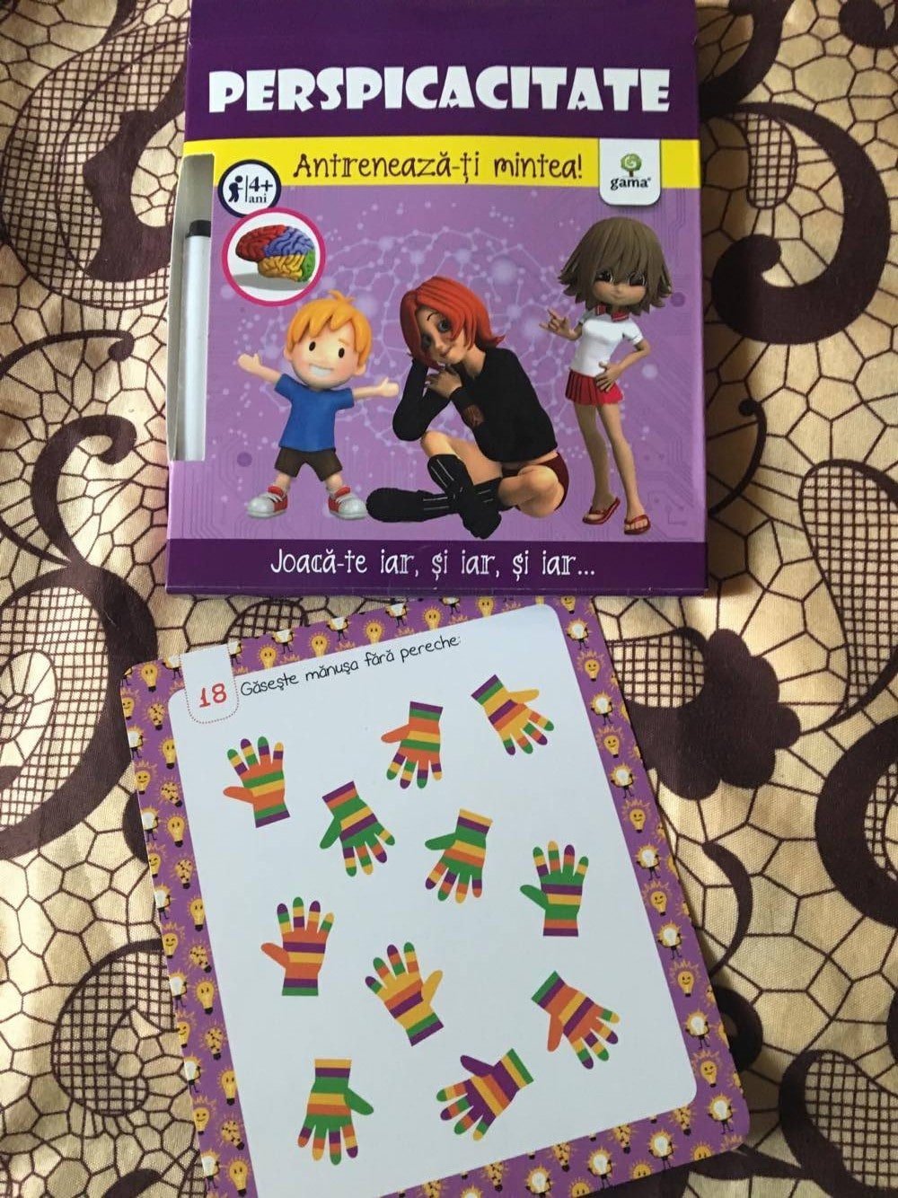 Perspicacitatea este cea de-a doua carte pe care am ales-o. De fapt sunt niște cartoane și un marker cu ajutorul căruia, copiii învață să facă un fel de fișe. Aceasta este pentru copiii de 4 ani plus și clar nu ar înțelege Criss mare lucru din ea. Am preferat să arunc eu o privire pe ea și s-o pun la păstrare. Dacă ar fi ajuns acum pe mâna ei, cred că le-ar fi mâzgâlit și nu ar fi înțeles mai nimic din rolul acesteia.