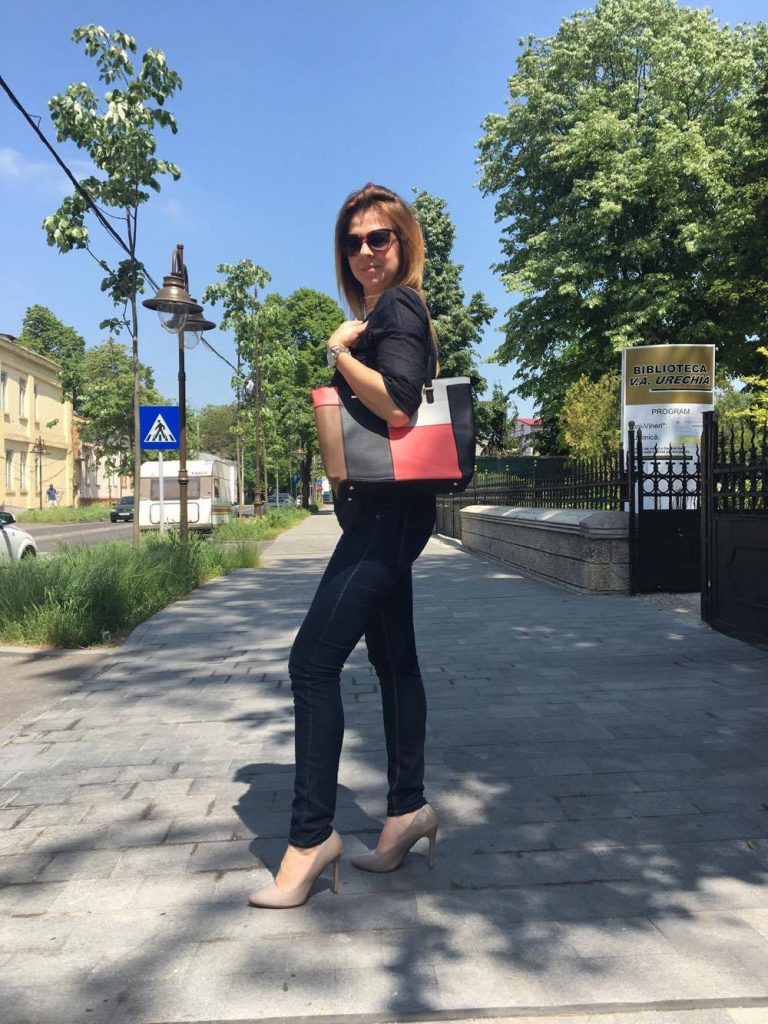 Geanta este una dintre cele mai noi piese vestimentare din acest outfit. Am să vă povestesc câteva cuvinte și despre restul. Geanta are o bază neagră și pe partea din față are câteva combinații de culori din alb și roz. Îmi place mult geanta pentru că este foarte încăpătoare și poate fi ușor de asortat. M-am gândit că trebuie s-o pun pe ea în evidență și nu am vrut să iasă vreo altă piesă vestimentară în evidență. Geanta a ajuns la poșta locală și dacă vreți s-o vedeți pe site, intrați .