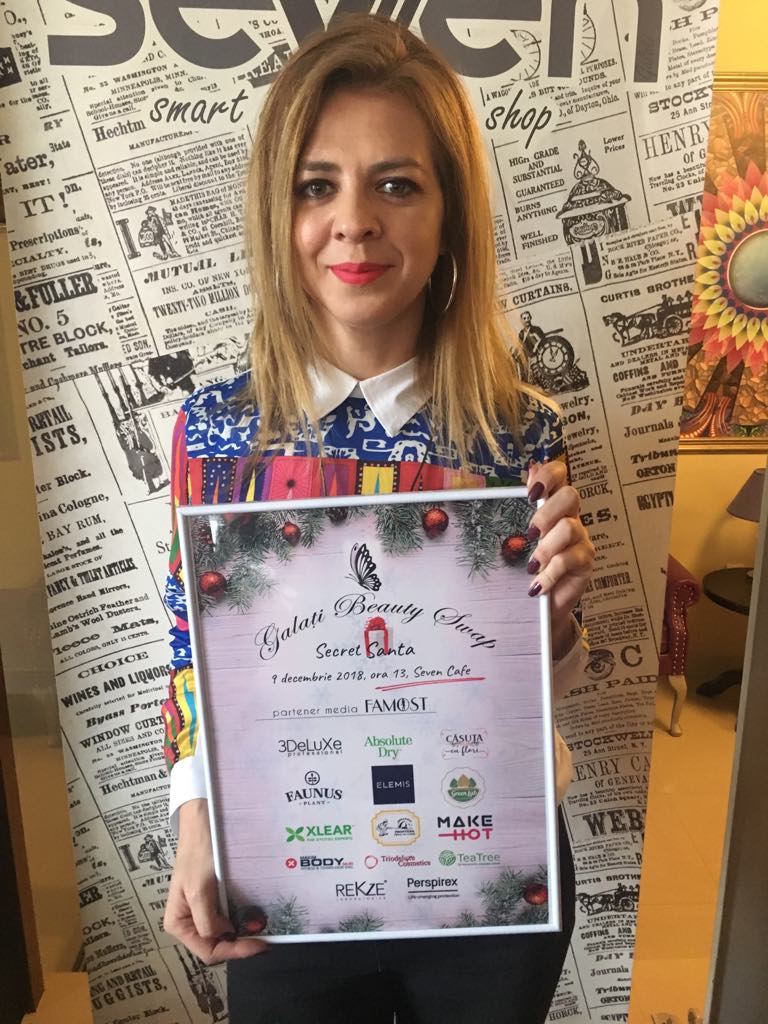 Nu mă gândeam că v-om avea și sponsori având în vedere că a fost un eveniment programat relativ din scurt. Ioana ne-a surprins și de această dată și am primit câteva produse cu care să ne răsfățăm în acest sfârșit de an. Sponsori – 3DeLuxe, Căsuța cu Flori, Faunus Plant, Elemis – Adda Shop, Green Lab, MakeHot, XLear, Brutăria Frontera( am scris aici), Maxim Body Galați, Triodeluxe Cosmetics, TeaTree, Rezke și Perspirex. Mai jos vă las poze cu produsele primite, dar și câteva poze cu mine de la eveniment.