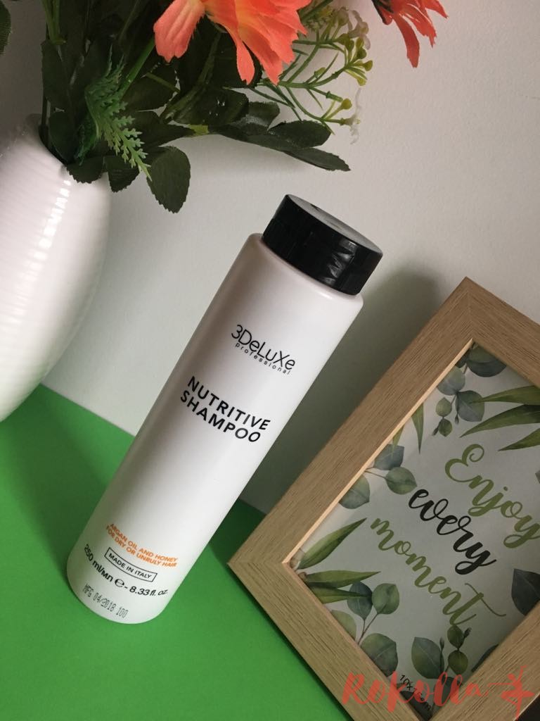Șamponul 3DeLuXe este un produs profesional și asta m-a făcut să am o încredere sportiă în el. Are ca principale ingrediente uleiul de argan și mierea. Are o textură lichidă și o culoare portocalie. A trebuit să fiu atentă cu el pentru a nu risca să-mi curgă printre degete. Este un produs care are un grad de spumare bun și care curăță delicat părul. Mi-a plăcut că părul meu s-a păstrat curat până la 4 zile.