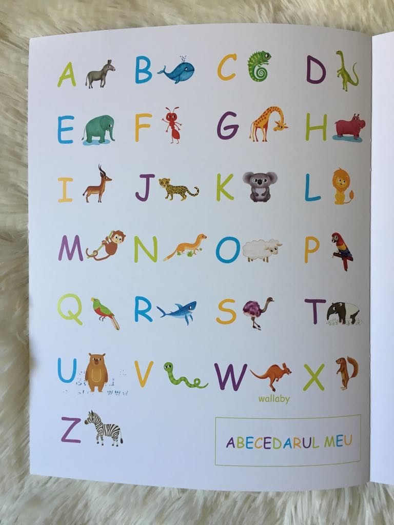 Alfabetul este știut de către fetița mea doar că în engleză. Un cântecel ascultat când era micuță a făcut-o să învețe alfabetul destul de rapid. Problema este că acum în loc să zică „a” zice „ei”. Ea cunoaște pronunția în engleză și fix aceeași problemă am avut-o o perioadă lungă de timp cu numele culorilor în engleză. Acest alfabet are rolul de a consolida cunoștințele copilului cu ajutorul animalelor. Aș putea să spun că asocierea literelor cu animalele face mult mai plăcută învățarea.