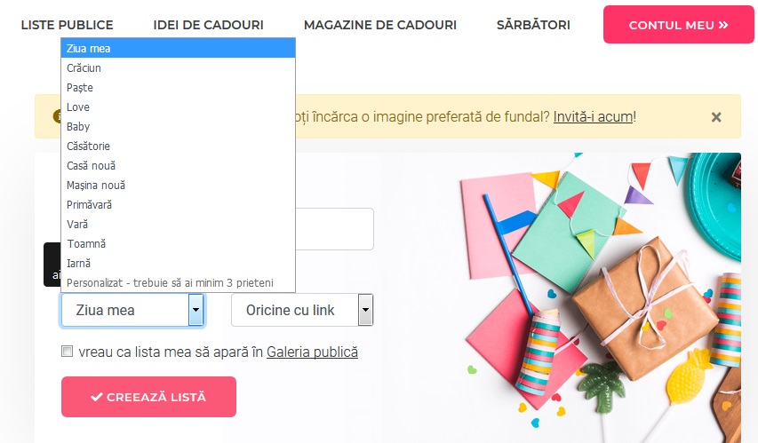 Primul pas este crearea unui cont pe site în care se menționează și data nașterii. Următorul pas este crearea unei liste în functție de evenimentul care urmează să aibă loc. Sunt foarte multe evenimente pe site precum: nuntă, botez, casă nouă, petrecere, zi de naștere, etc.