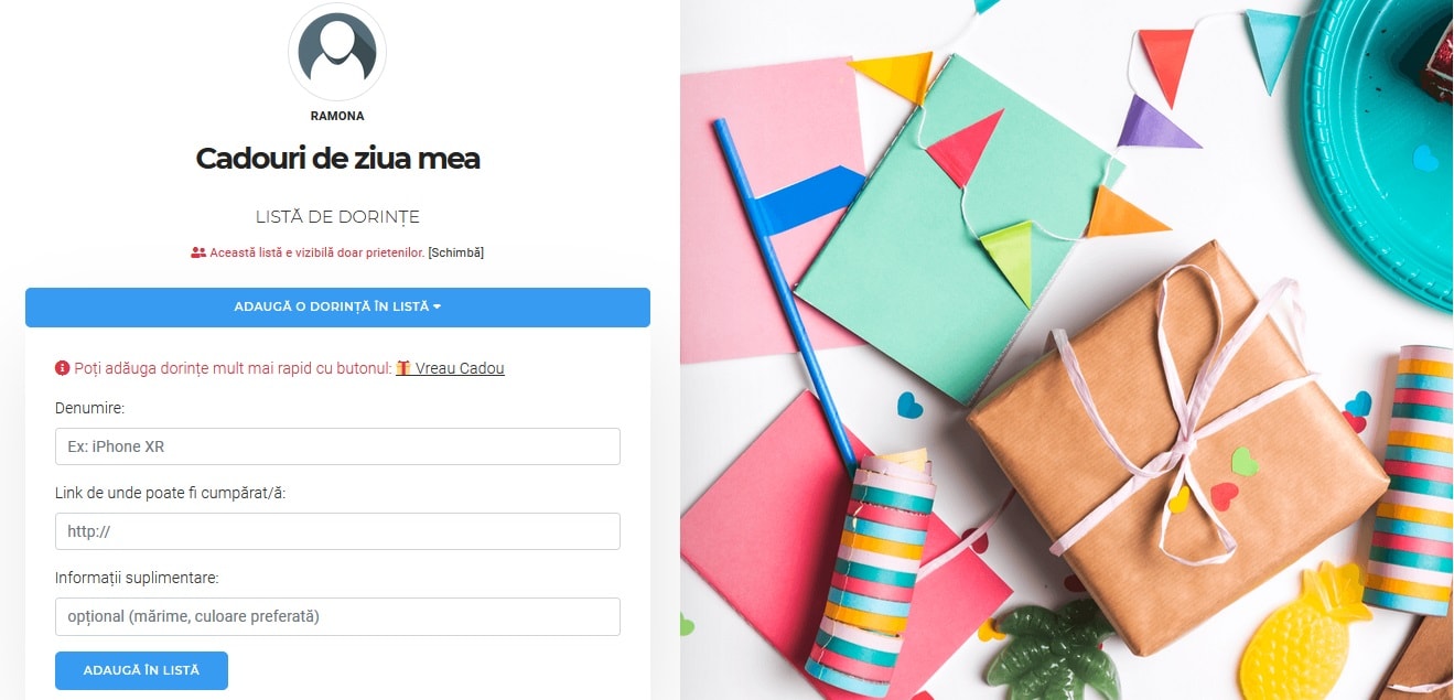 Este primul an în care am aplicat această metodă de abordare a petrecerii mele, iar dacă aceasta va avea succes, voi repeta procedura și pentru celelalte evenimente importante din viața mea. Vă invit și pe voi pe Cadolist.ro să vă creați propria listă. Vă asigur că prietenii o vor consulta cu drag