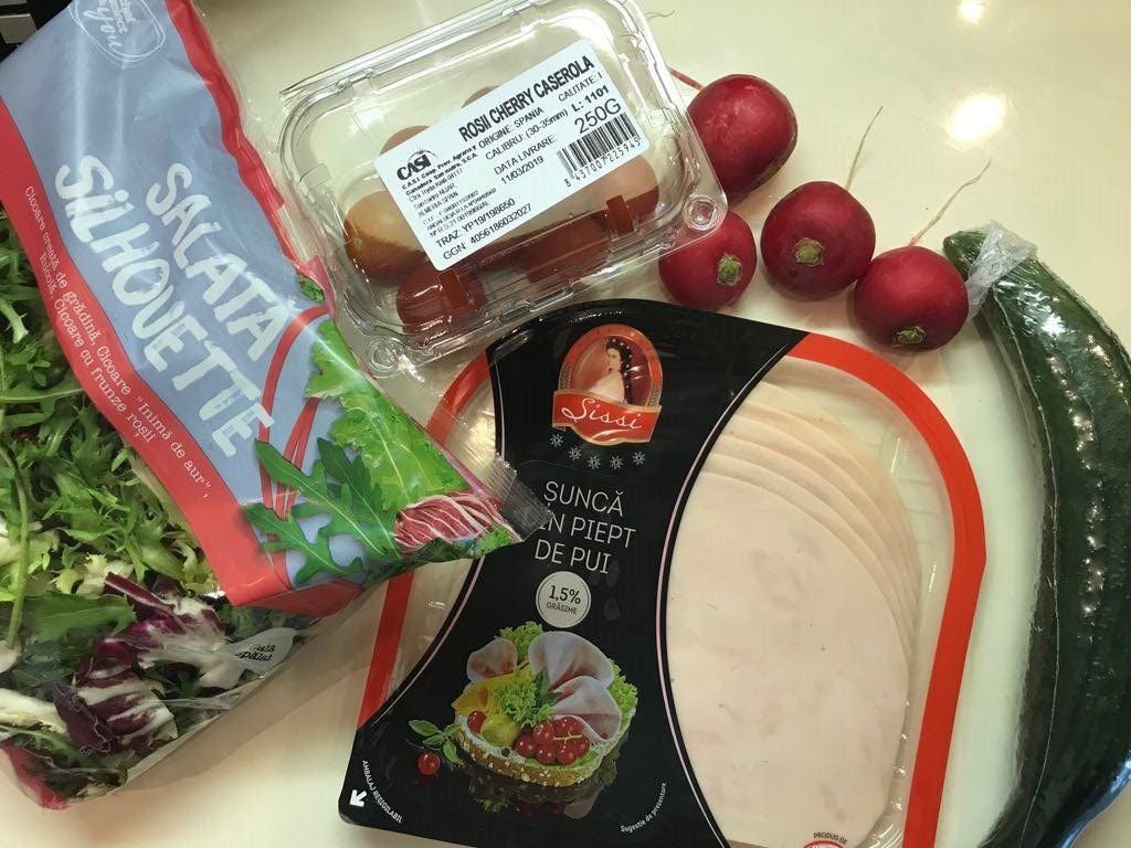 Ingrediente salată : o salată verde, o pungă de salată gata spălată sau o mână generoasă de rucola, ridichi, castravete, roșii și năut.