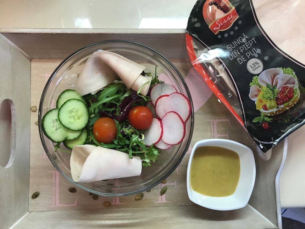 Astăzi vă propun să încercați o salată rapidă pentru acele zile în care nu aveți foarte mult timp la dispoziție. Vreau să vă spun că salata o puteți personaliza în funcție de preferințe. Verdeața o alegeți în funcție de ce aveți în casă, la fel și sortimentul Sissi folosit, dar vă rog să păstrați dressing-ul pentru că este delicios.