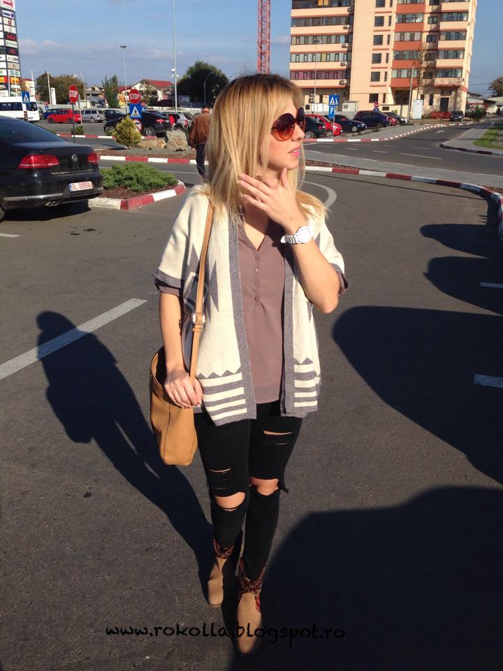 Pentru acest outfit am folosit o pereche de blugi negri elastici rupți. Îmi place să îi combin cu cizme și îmi doresc ca vremea asta prietenoasă să țină cât mai mult timp pentru că iubesc blugii rupți.
