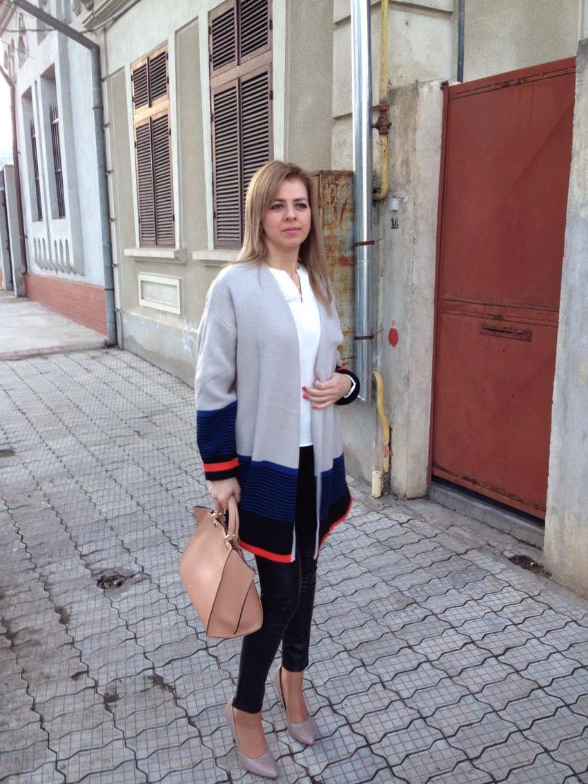 Mi-a plăcut combinația de culori ale acestui cardigan – gri, negru, albastru și portocaliu. Culoarea predominantă este gri și mi-a plăcut acea mică pată de portocaliu de la marginea mânecii și în partea de jos. Îmi place că este ceva mai lung și este aproape de genunchi. Am ales să îl port cu cei mai îndrăgiți pantaloni de piele, cu o bluză albă și pantofi cu toc.