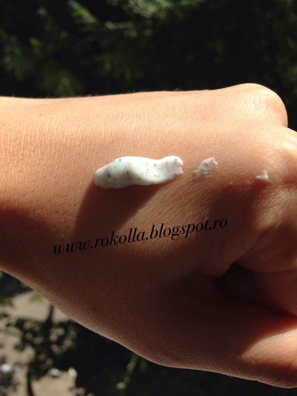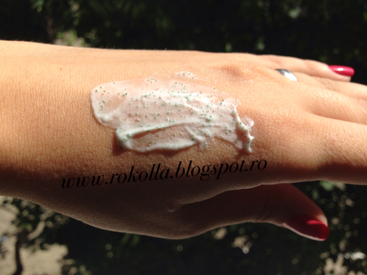 Crema are o culoare albă cu mici particule verzi și câteva portocalii. Are un miros plăcut, fresh și l-am asemăna cu iarba verde. După folosire pot spune că îmi simt tenul mai curat dar în privința punctelor negre nu am văzut vreo schimbare. Particulele abrazive sunt perfecte cât să le simți dar să nu deranjeze.