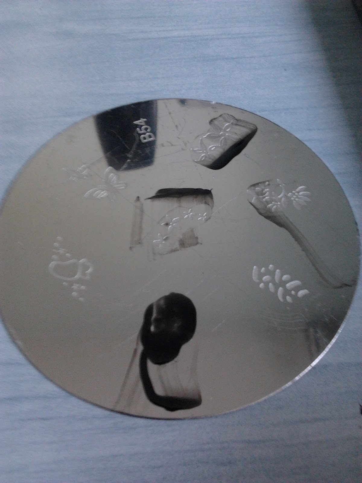 A venit timpul să o și încerc. Am urmat instrucțiunile și iată ce a ieșit. Pe plăcuța de metal sunt multe modele din care mi-am ales unul. Am acoperit modelul cu ojă după care am ras surplusul și …. surpriză. Când am ras surplusul de ojă de fapt toată oja după disc s-a luat. Și am încercat iar … și iar … și iar și acelaș rezultat.